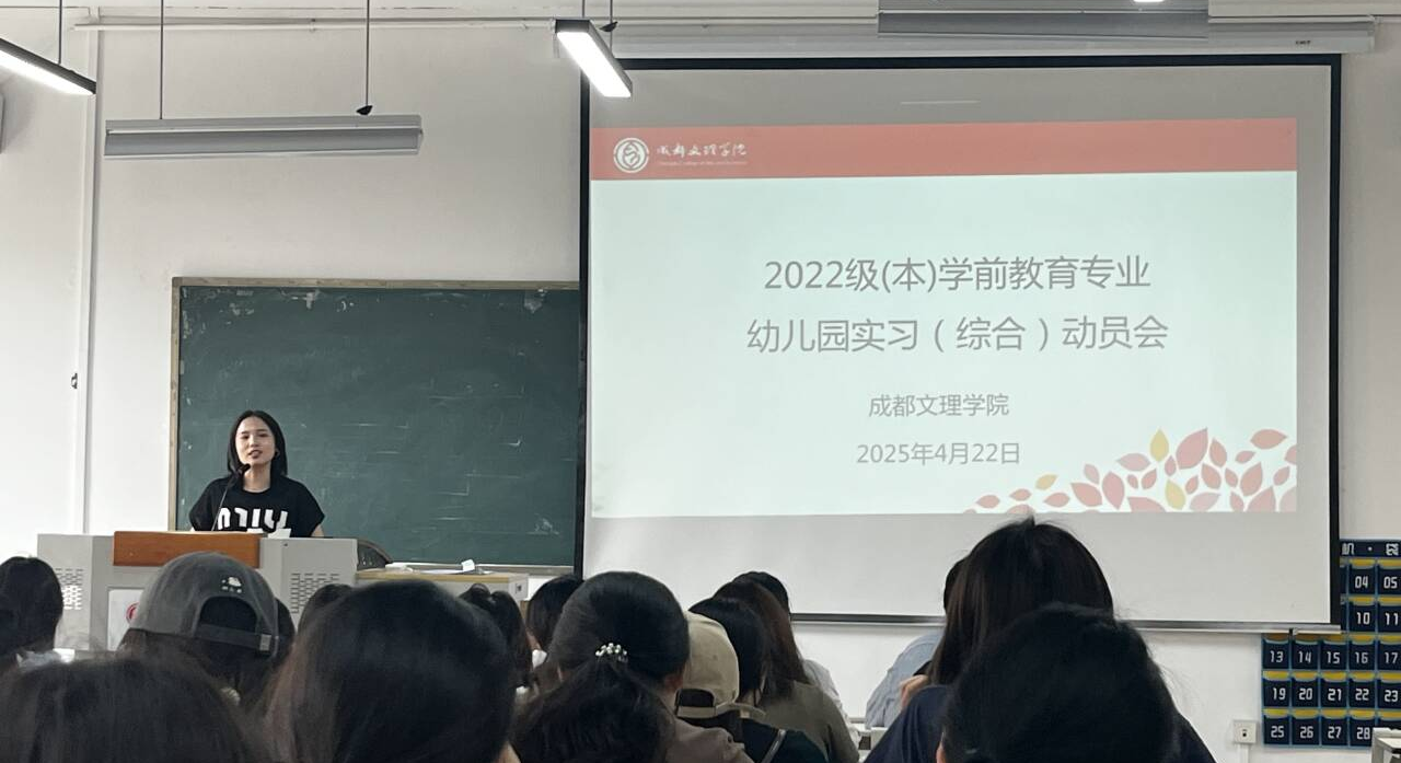 2025年4月22日,williamhill在主教学楼D401,组织召开2022级学前教育本科专业幼儿园综合实习动员会。教育公司党委书记舒彪、经理助理王和琴、学前教育系教师周斌、辅导员蒋丽,2022级学前教育专业本科全体同学参与本次会议。会议由王洁老师主持。