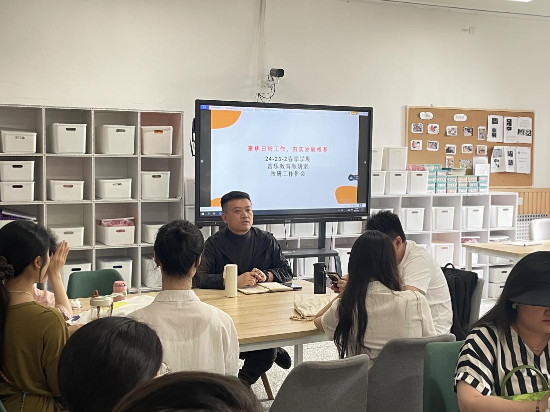 五月芳菲,教研正当时。为进一步推进教学工作的有序开展,提升教学质量,5月7日,音乐教育教研室在大教育实训中心A204召开了本月教研会议。会议由教研室副主任(主持工作)马子杰老师主持及全体音乐教育教研室教师参加。会议中马子杰老师对下列内容做出安排和提示: