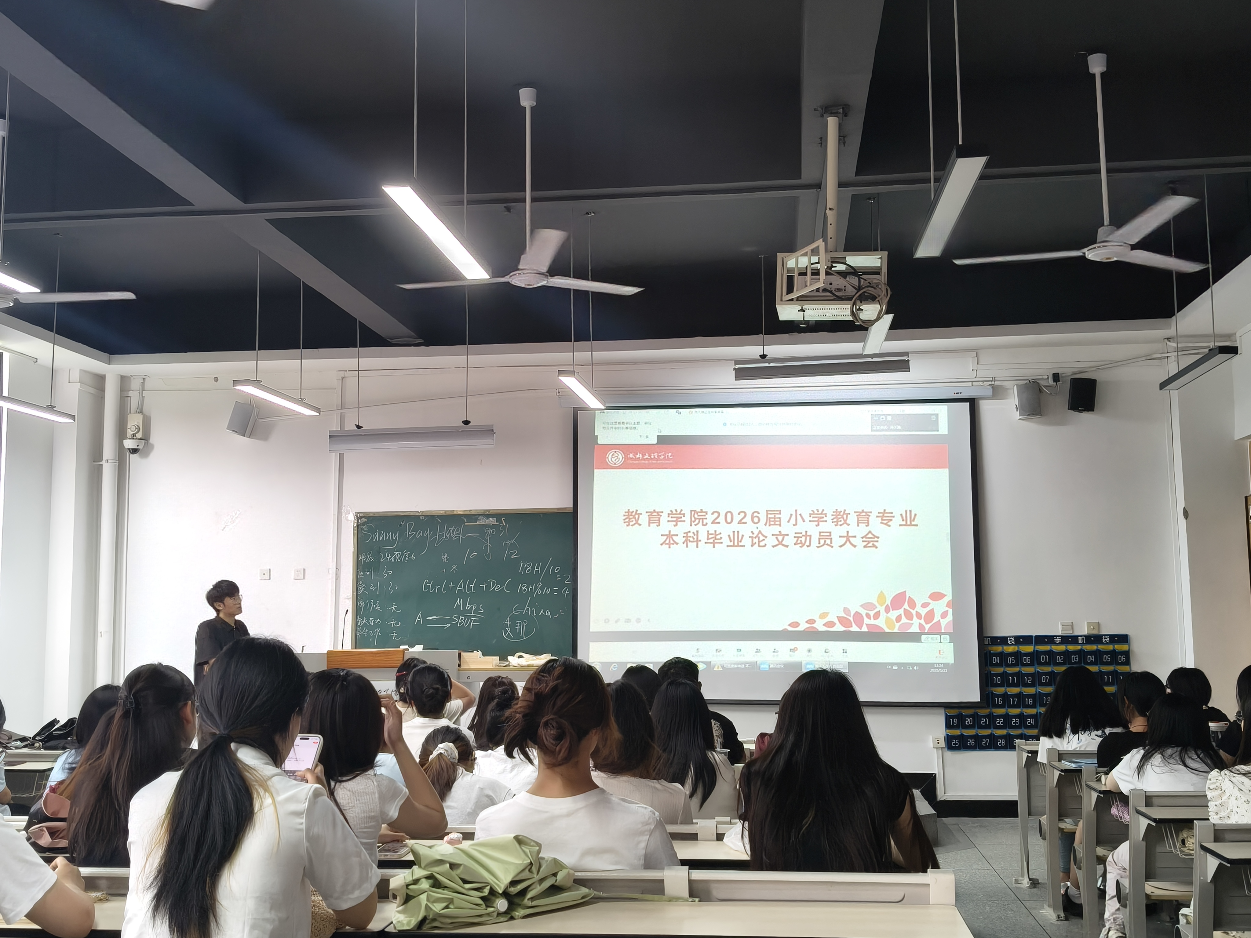 2025年5月21日下午,初等教育系在主教学楼B栋402召开2026届小学教育专业本科毕业论文动员大会。会议由陈天赐老师主持,初等教育系副主任张晓菲、全体专任教师及2026届毕业生参会,会议旨在明确毕业论文工作流程、学术规范及考核要求,为毕业生顺利完成论文奠定基础。