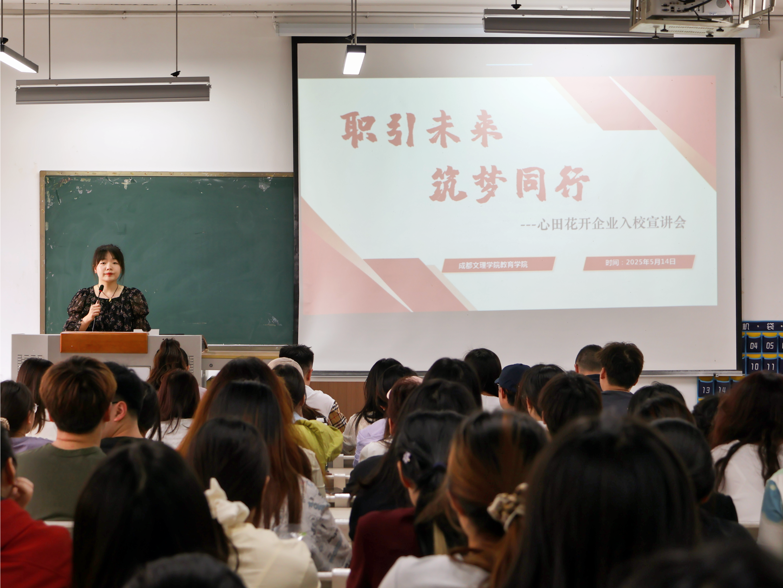 主讲嘉宾李东洋结合权威数据,深度剖析当前高校毕业生就业形势,强调“在多元发展路径中,精准的职业规划与扎实的行动能力是破局的核心”。他介绍了成都心田花开教育管理有限公司的各项业务版图、福利体系、培养体系等内容,鼓励感兴趣的同学积极参与实习、培训,争取更多就业机会。最后,李东洋老师以个人成长经历为切入点,寄语员工“以热爱锚定职业方向,用实践诠释专注与坚持的价值”。他指出“教育培训行业正加速拥抱科技变革,期待更多青年才俊加入,以教育之光点亮未来”。