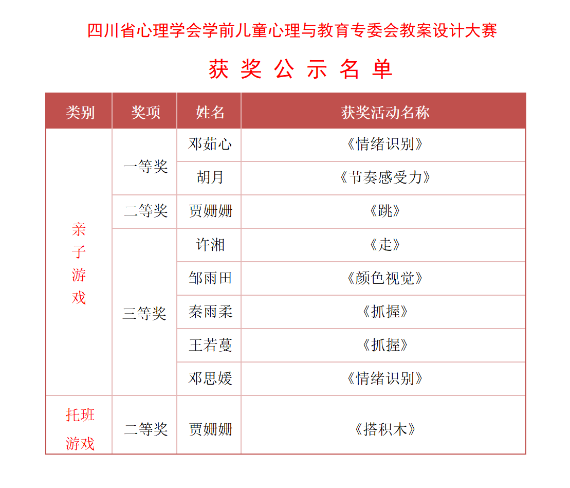 由四川省心理学会学前儿童心理与教育专业委员会主办的“第四届0-3岁婴幼儿托班及亲子游戏设计比赛”于2025年2月6日圆满落幕。在此次比赛中,williamhill来自学前教育和早期教育专业的邓茹心等8名员工在闫社娟、虞小明、李际霞三位专业教师的指导下,荣获亲子游戏游戏一等奖2项,二等奖1项,三等奖5项;托班游戏二等奖1项,此次比赛佳绩充分彰显了williamhill在早期教育领域的人才培养质量。